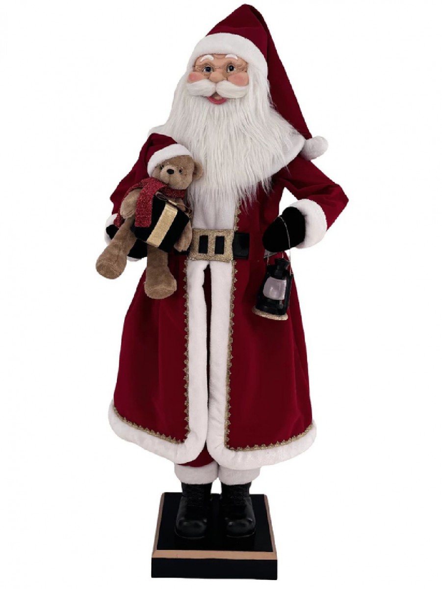 Step into Christmas magic with the 1.5m Classic Singing Santa Animated Toy With Lantern & Teddy Bear. Moving side to side while joyfully singing "Jingle Bells", this life-size wonder is a popular, inspiring showstopper. Make him the heart of your home - bring Santa in and let the merriment begin!