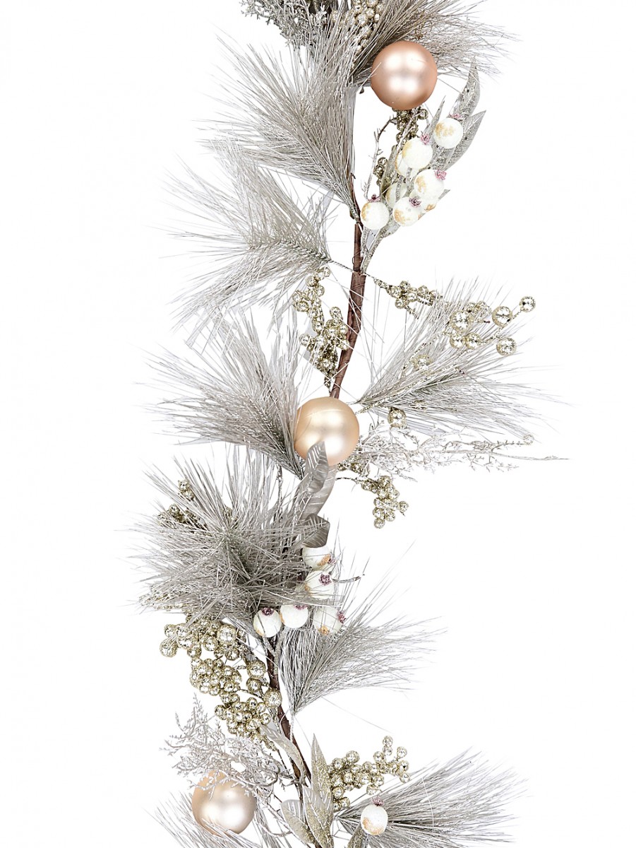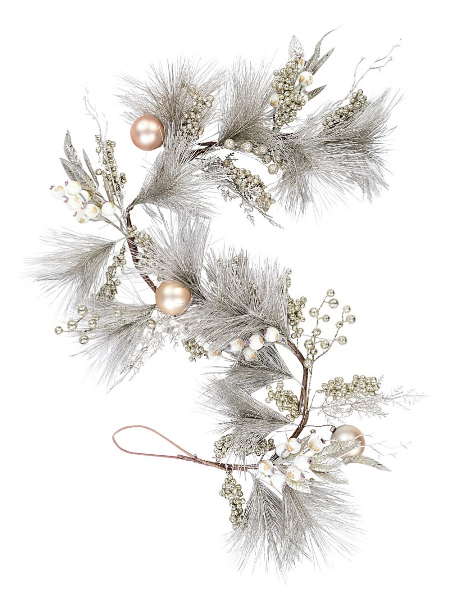 Decked out in an elegant champagne colour, it's pre-decorated and ready to use - no assembly or endless fluffing needed (phew). You'll find Weymouth pine tips, gold sequins, frosted berry branches and the most beautiful white berries glazed in rose gold & silver sparkle. It all feels so Christmassy - like walking through a forest covered in frost after a soft snowfall. Each garland comes with a handy hook ring for easy hanging anywhere you want that extra touch of festive glam. And those wired branches mean you can reshape and spruce things up however you like.