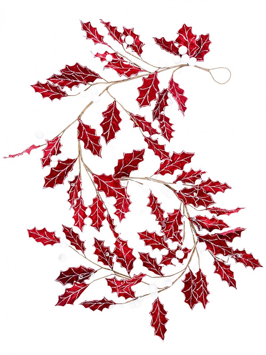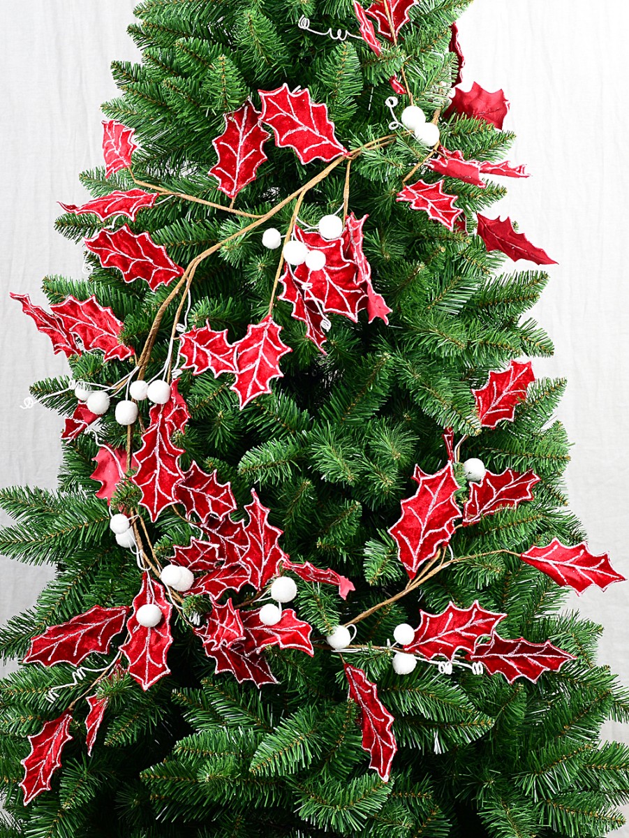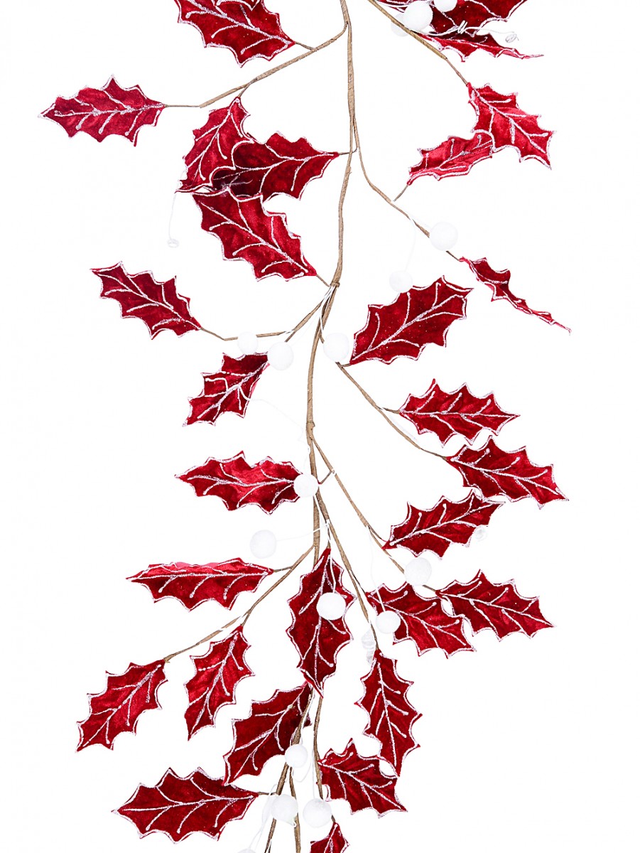 Our 1.8m Red Velvet Holly Leaf & Snow Berries Christmas Vine Garland is about as festive and luxurious as it gets for those of us who want to truly deck the halls. The red velvet holly leaves with white berries and silver glitter veins really pop against all sorts of holiday backdrops, from traditional green Christmas trees to deep navy blue or gold themes. And when you add in all those squiggly wire branches and berries dusted with silver sparkle - there's this frosty magic that happens.
