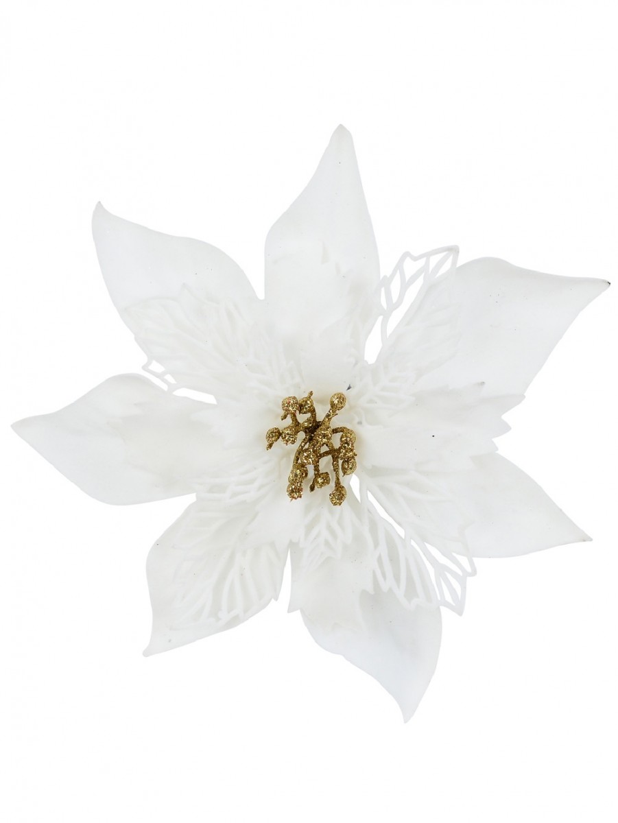 The poinsettia, with its graceful and realistic appearance, is a powerful element for creating visually striking holiday decorations. Whether you want to spruce up your Christmas tree, wreaths, or garlands, or add a touch of greenery to your mistletoe, this floral pick brings the right tone and richness to set a festive mood. This Christmas floral pick comes equipped with an alligator clip, making it effortless to attach to various surfaces, including Christmas trees, wreaths, garlands, centrepieces, bouquets, and floral arrangements. The combination of white petals and the glistening gold centre gives it a timeless and sophisticated look, making it a versatile choice for holiday decorating. Its embodiment of luxury and sophistication makes it an ideal choice for elevating your holiday decor.