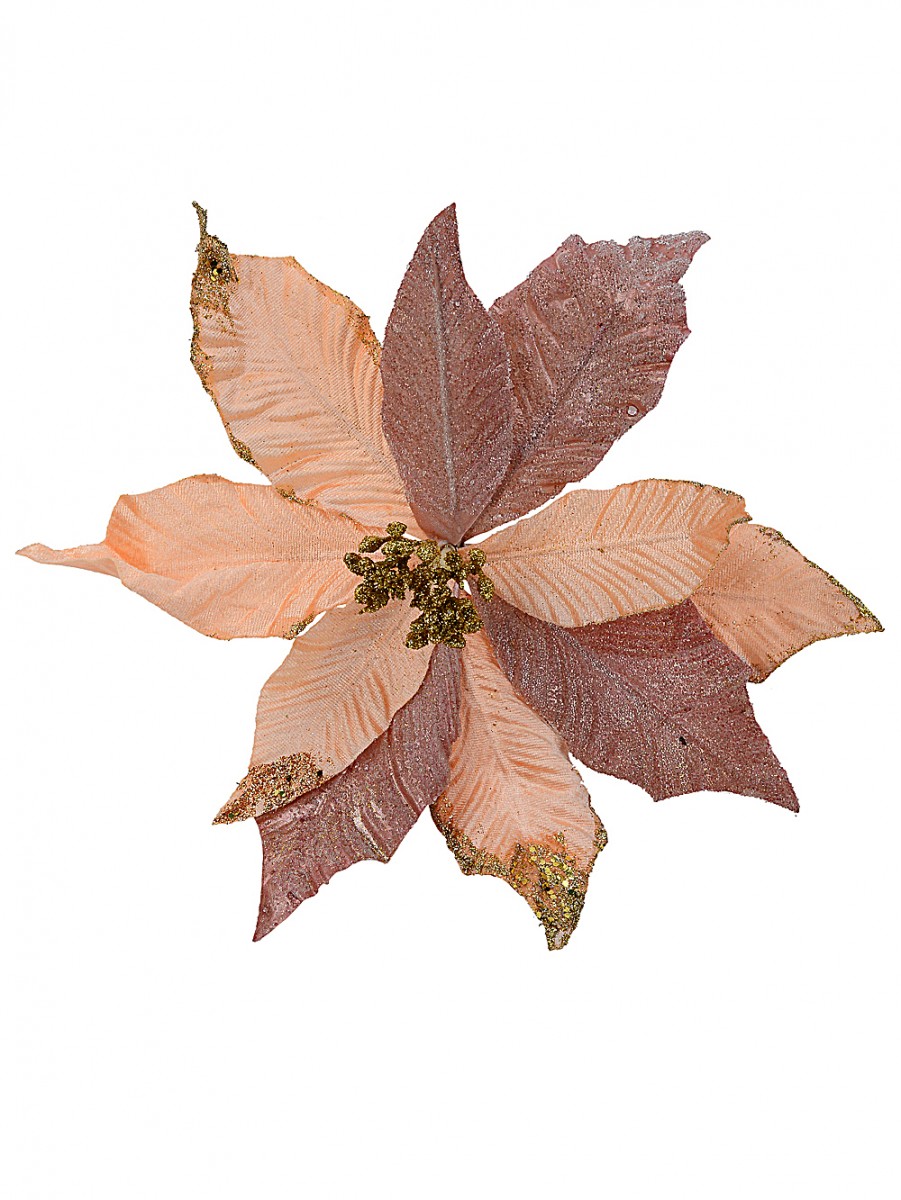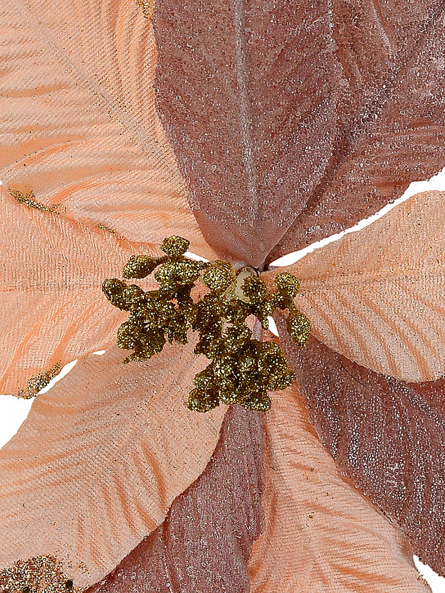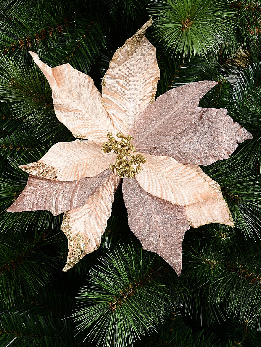 The colors rose gold and pink always give a pleasant vibe in whichever form they are. This Christmas pick has elegant pink and rose gold poinsettias with three styles of leaves. The gold glittered edge, pink with a gold glittered tip, and rose gold with dew look beads enhance the beauty of this pick. As leaves have veins shown in them, this pick includes netted textured veins. Flower buds are in gold and white pearls look like dew-like beads. It also includes wired pink leaves for simple flowering to complement its color, form, and feel. This pick's stems are 80mm long. For its easy attachment to decorating Christmas trees, wreaths, garlands, centerpieces, bouquets, and floral arrangements, it includes an alligator clip. To feel the vibe of the color of this beautiful piece, buy it now!