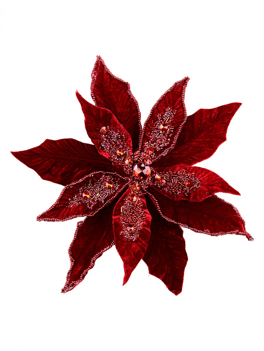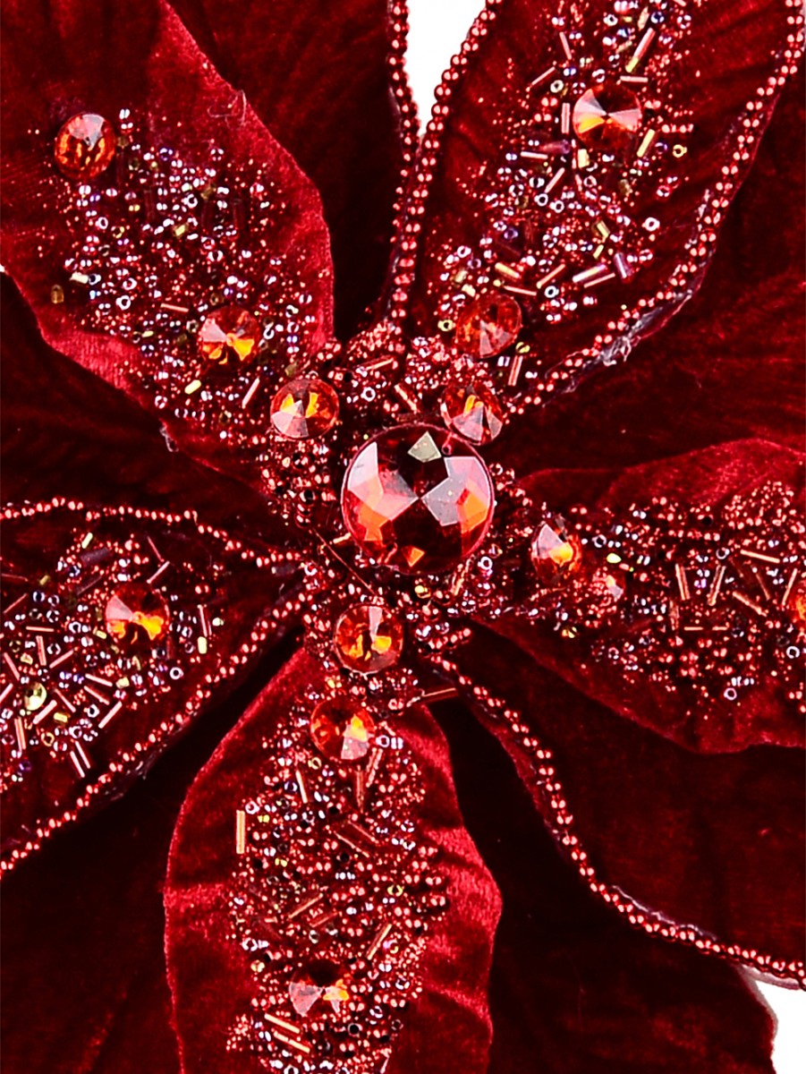 You can see in the dimensions (32cm x 32cm x 20cm) that it makes a statement, but we've found it actually still fits really well with both traditional and modern themes. And the pop of colour? Well, it stands out in all the right ways with textured fabric bract styles in maroon decorated with mix colour bugle beads, hole beads, red diamantes and red ball bead margin. The centre of the pick is just as stunning with a red glitter cyathia, featuring more beautiful shades of purple, green, blue and red.