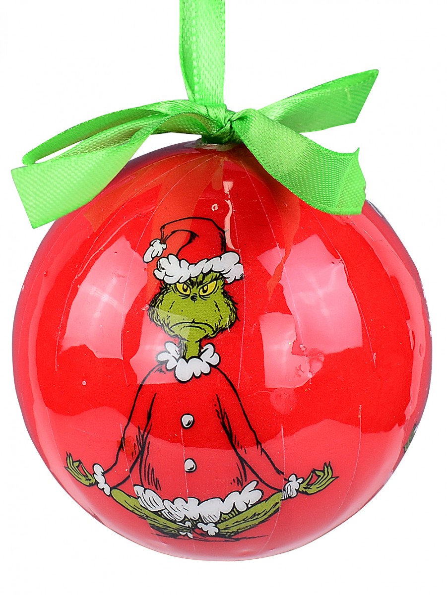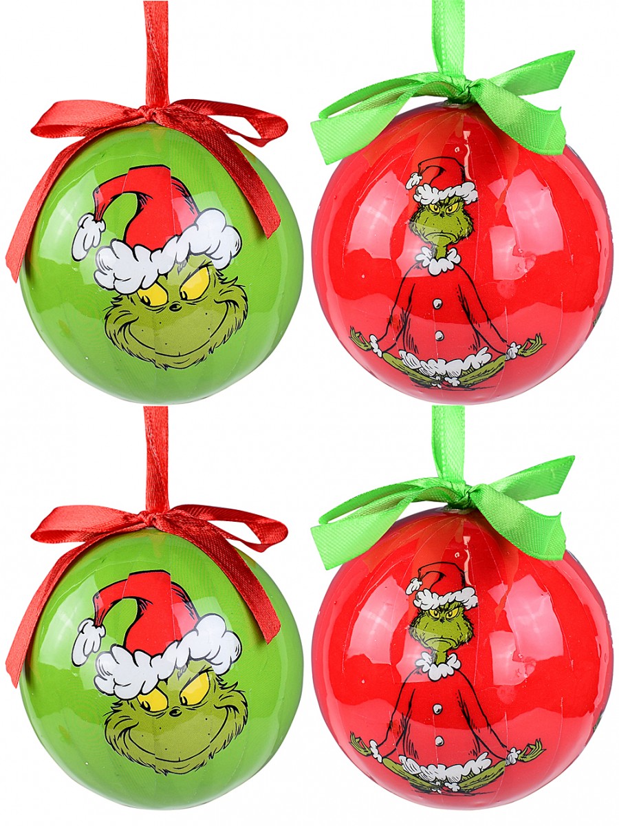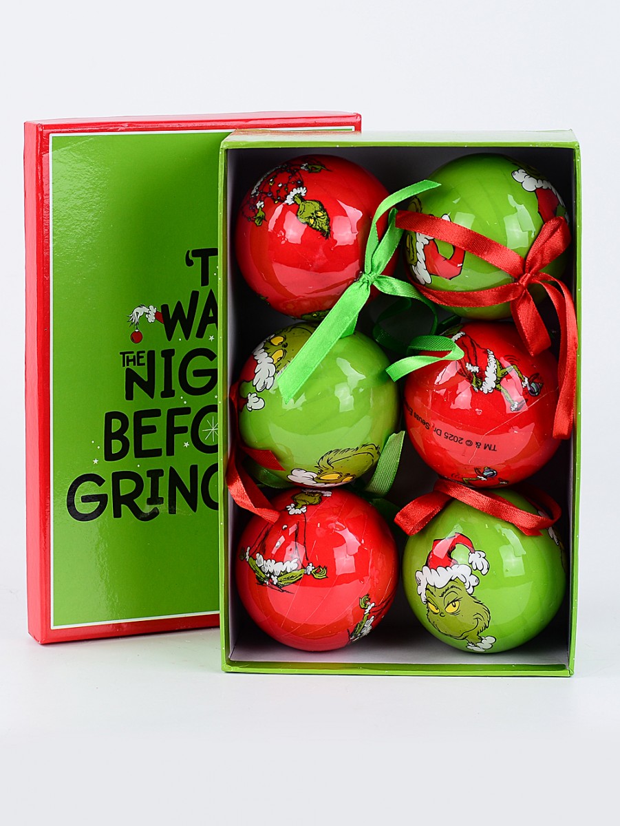They're officially licensed Dr Seuss Grinch ornaments, which matters heaps for true fans of classic tales. Three green baubles feature the Grinch's iconic face - that sneaky grin, you know? And three red ones with his foot tapping a bauble. Perfect balance! The red ones have a green ribbon and green ones have a red ribbon to hang them.