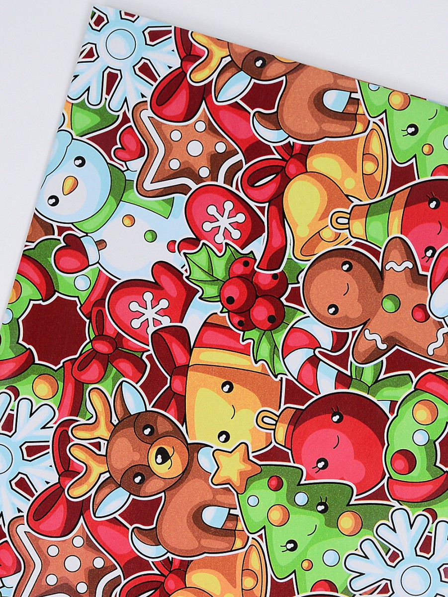 - colourful print with various Christmas icons including snowman, gingerbread man, reindeer, plus many more
