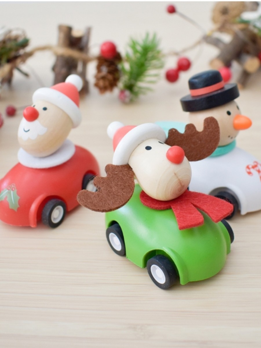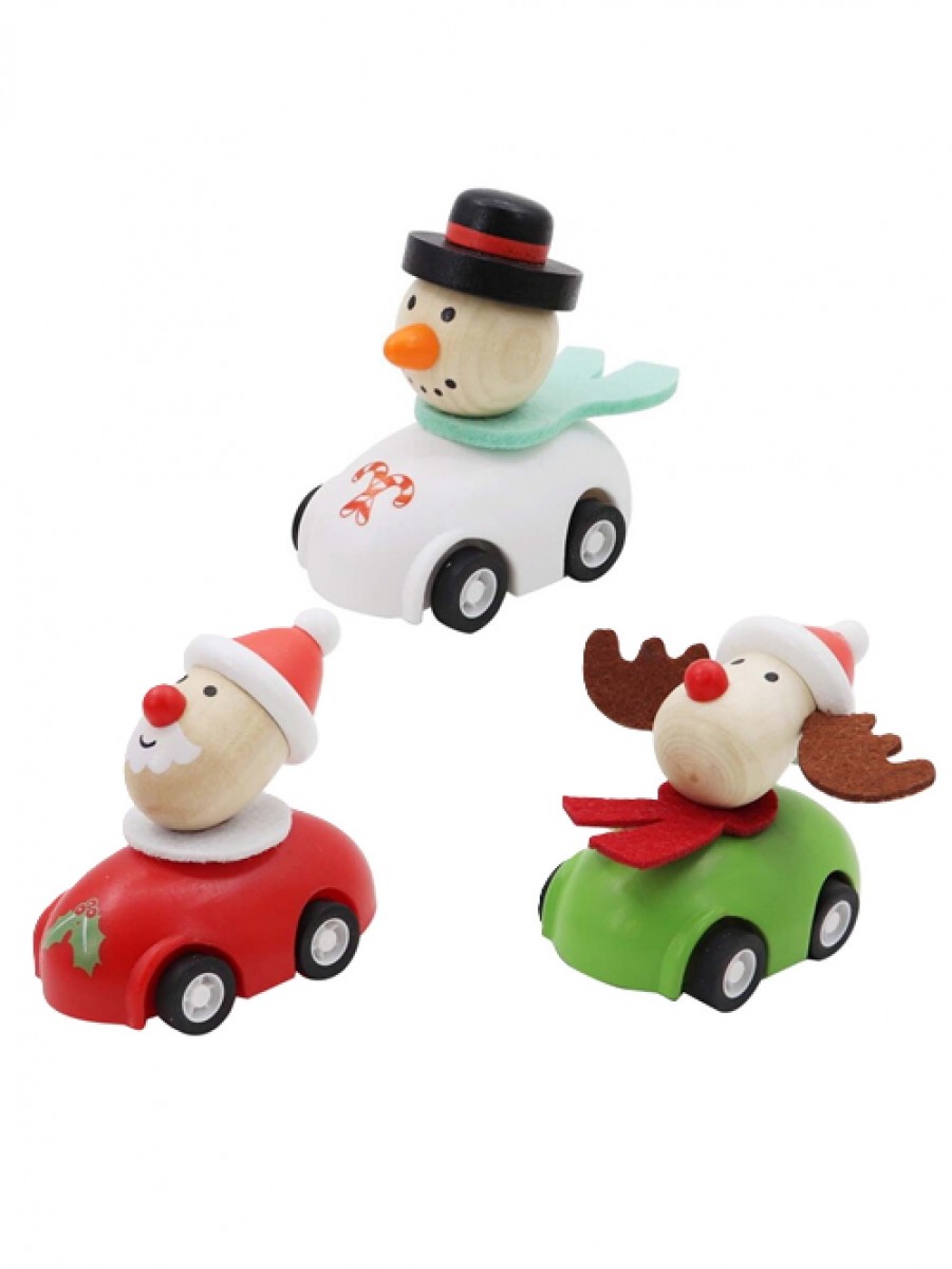 Christmas pull-back cars with wooden Santa, snowman & reindeer
