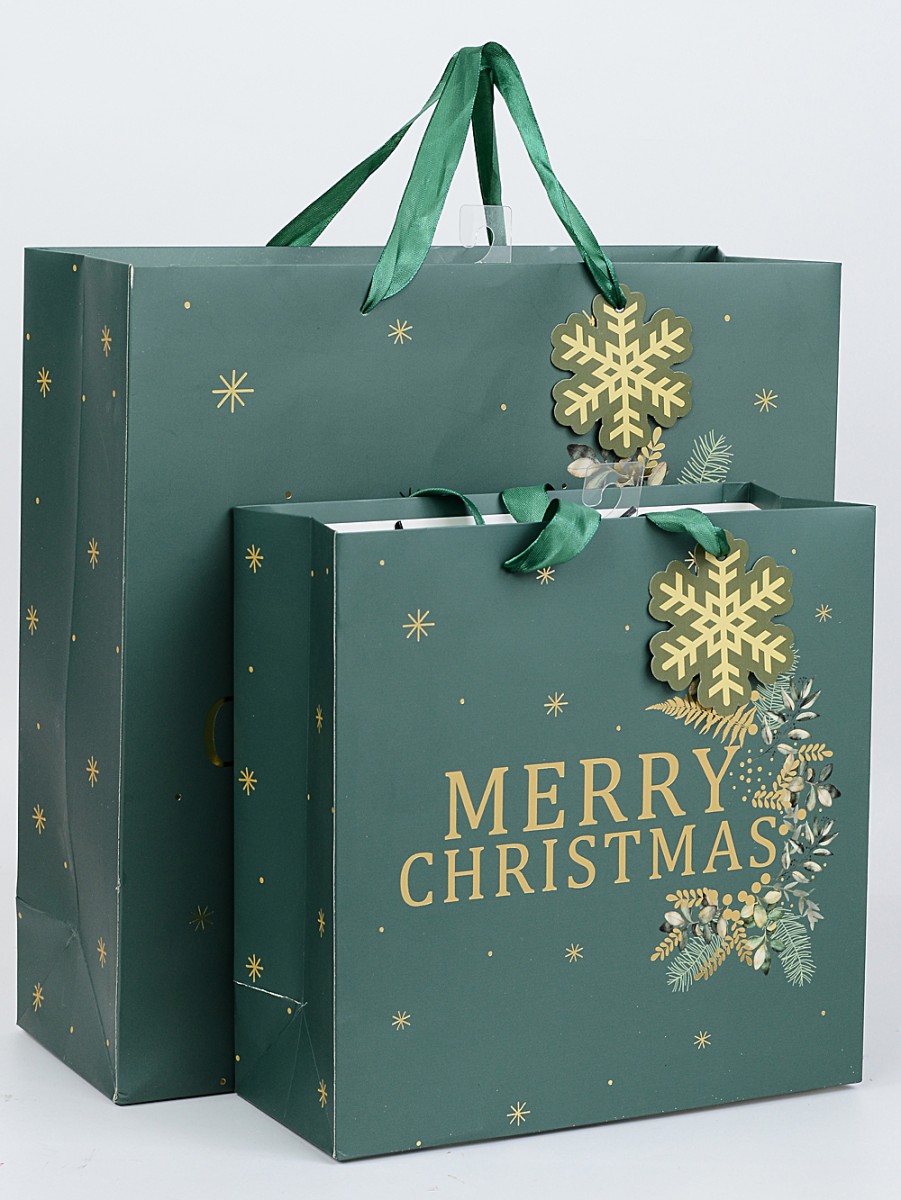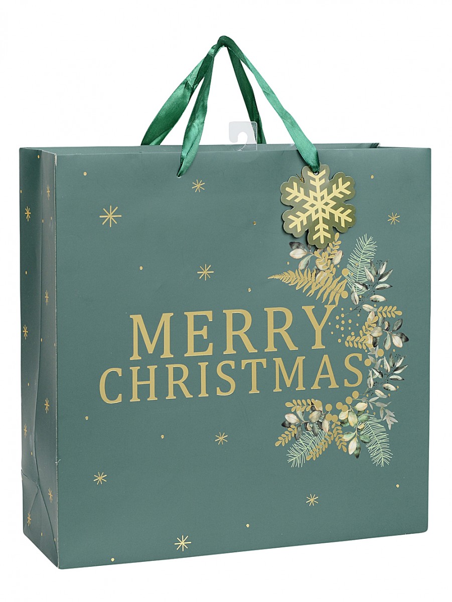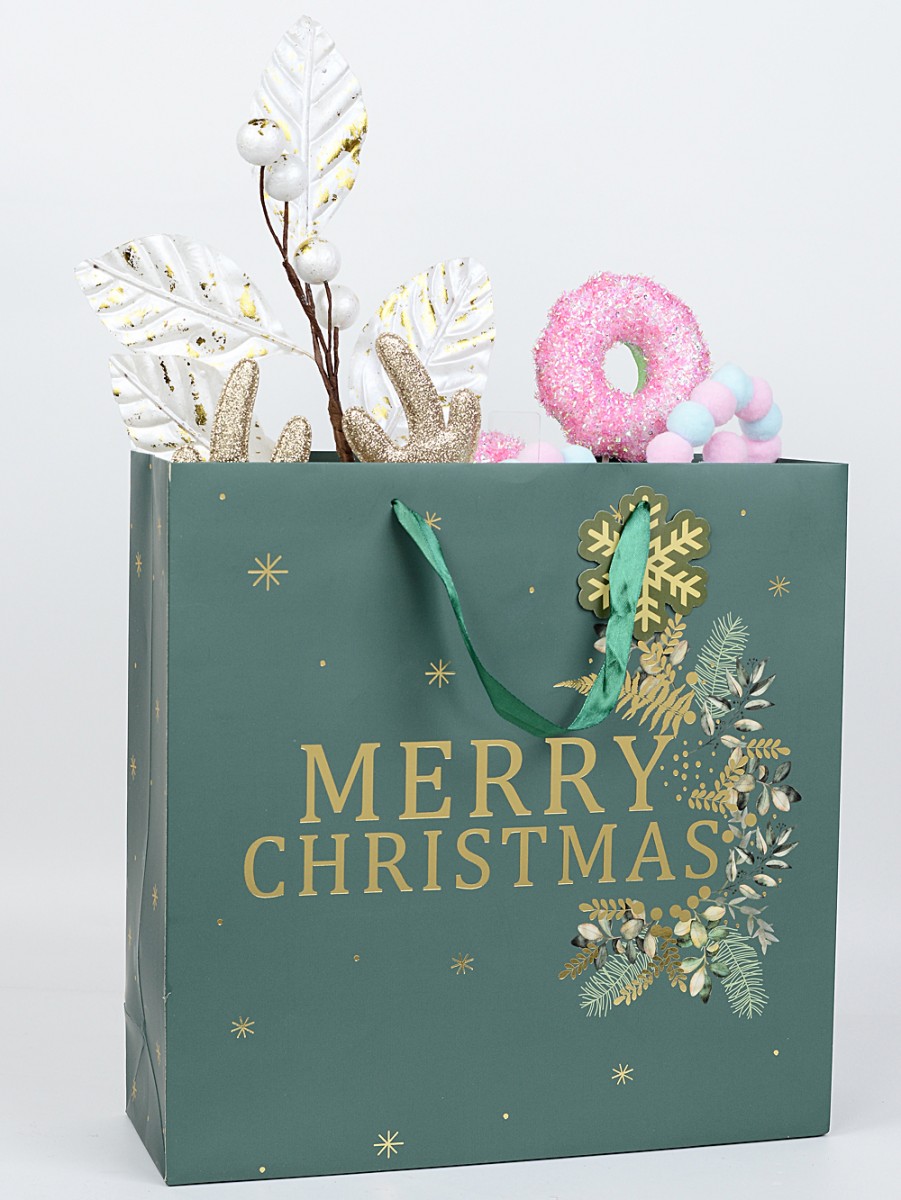 Delight in the whimsical ease of gift-giving with this medium green bag, cheerily adorned with golden 'Merry Christmas' wishes and refreshing foliage flourishes. Strong, sophisticated, and ever-so-handy, it's the charmingly simple way to wrap without the wrangle. Add it to your festive toolkit today - your perfect gift deserves it!